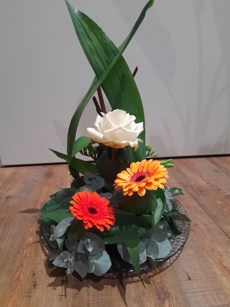 | Thema: Wees welkom Vandaag: Samuel uit Oeganda De schikking stelt een kerk voor, waar de dominee (de witte roos) ieder welkom heet met uitgespreide armen. Samuel (de oranje gerbera) slaat zijn arm om Grace (de lichtere gerbera). De gerbera betekent: door jou wordt alles mooier. Oranje is de kleur van vrolijkheid en blij zijn. Eucalyptus betekent: bescherming. |
