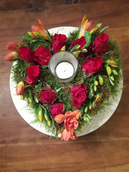 | Thema: Wees welkom Vandaag:Arun uit India. Jezus welkom heten begint met een lichtje in je hart. De schikking heeft de vorm van een hart, gevuld met rode roosjes en fresia’s. Rode rozen zijn het symbool van liefde, fresia’s symboliseren gedeelde vreugde. Mos betekent liefde als van een moeder. In het hart brandt een lichtje. |