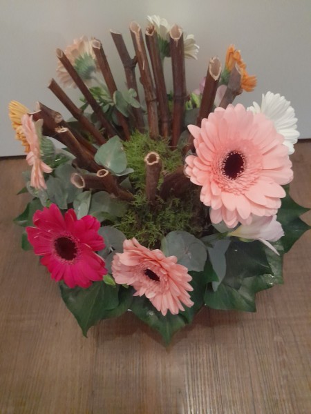 | Thema: Wees welkom Vandaag: Miriam uit Israel In Jezus’ tijd werden je voeten gewassen als teken van welkom. De schikking met in het midden de bamboestokjes, stelt een waskom voor waar omheen mensen staan. Verschillende kleuren gerbera’s staat symbool voor verschillende mensen. Gerbera’s betekenen: door jou wordt alles mooier. Fresia’s betekenen: gedeelde vreugde, eucalyptus staat voor bescherming en bamboe voor oprechtheid. |